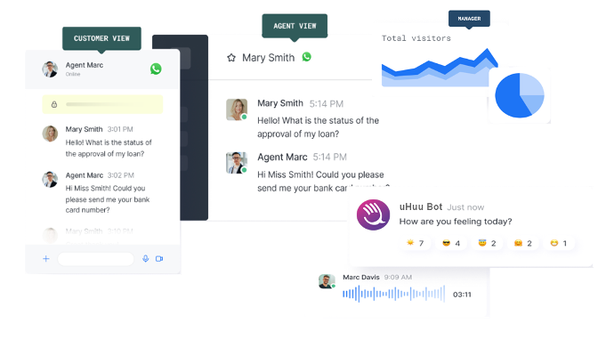Uhuu! Permite responder llamadas, videollamadas, mensajes de texto, chats en directo y consultas externas como WhatsApp, Telegram y redes sociales desde un único centro en un entorno seguridad y privado.